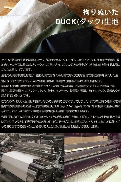 このARMY DUCK生地は現在アメリカでは再現できなくなってしまった1870年当時の織規格を可能な限り再現するため当時と同じ織機を使い忘れ去られてしまった古の織物を当時の資料を基準に復活させています。