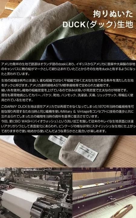 このARMY DUCK生地は現在アメリカでは再現できなくなってしまった1870年当時の織規格を可能な限り再現するため当時と同じ織機を使い忘れ去られてしまった古の織物を当時の資料を基準に復活させています。