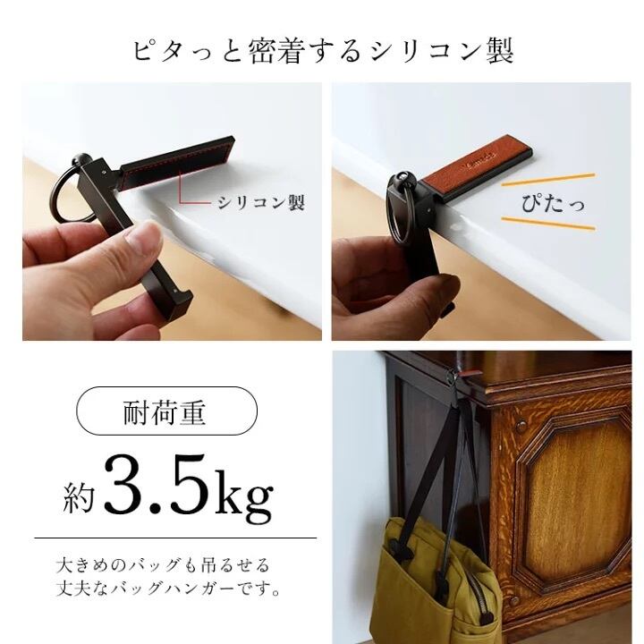 デスクやテーブルに引っかけるだけでバッグを吊るすことができます。